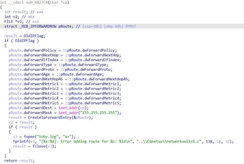百度了一下,CreateIpForwardEntry是会返回错误代码的,在toby.log里面打印出来应该可以确定错误的原因;盲猜是sub_4027C0的参数没有正确传递,使得pRoute.dwForwardDest重新赋值失败
