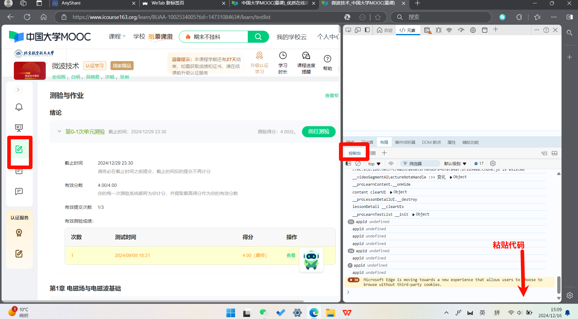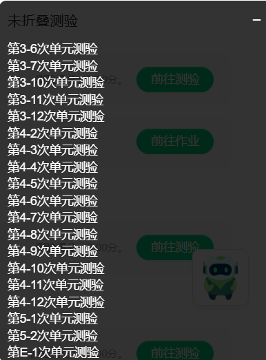 var t = document.querySelectorAll("a.j-quizBtn.u-btn.u-btn-default.f-fr"); for(let i=0; i < t.length; i++){ if( t[i].textContent == '前往作业' ){ functiondelay(ms) { returnnewPromise(resolve =>setTimeout(resolve, ms)); } awaitdelay(2000); t[i].click(); awaitdelay(2000); console.log(document.querySelectorAll(".f-fl.j-hwname")[0].firstChild.data); if ( document.querySelectorAll('a.clickbtn.j-selfevabtn')[0].innerText != '100' ){ var self = document.querySelectorAll('a.clickbtn.j-selfevabtn'); self[0].click(); setTimeout(() => { var btn = document.querySelectorAll('.j-select'); btn[100].checked = true; var textareas = document.querySelectorAll('.j-textarea.inputtxt'); var textarea = textareas[0]; textarea.value = '非常好'; var submit = document.querySelectorAll('.u-btn.u-btn-default.f-fl.j-submitbtn'); submit[0].click(); var back =document.querySelectorAll("a.u-btn.f-fl.j-backbtn"); back[0].click(); }, 1000); }else{ console.log('已完成自评'); }